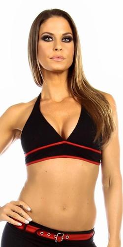 Sexy Burn Adjustable Tie Athletic Ring Girl Gym Halter Top - Black/Red features this stretch to fit supportive tie top and back sports bra top with contrast dynamic trim and halter design.