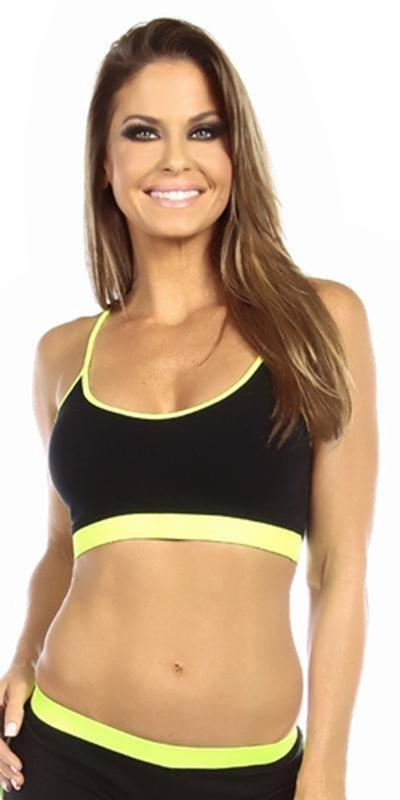 Feel the burn in style with this Sexy Neon Trim Fit Principle Athletic Crop Sports Bra Top. It's black as midnight but you'll be turnin' heads in the gym with its bright neon yellow trim. Get ready to incin-erate!