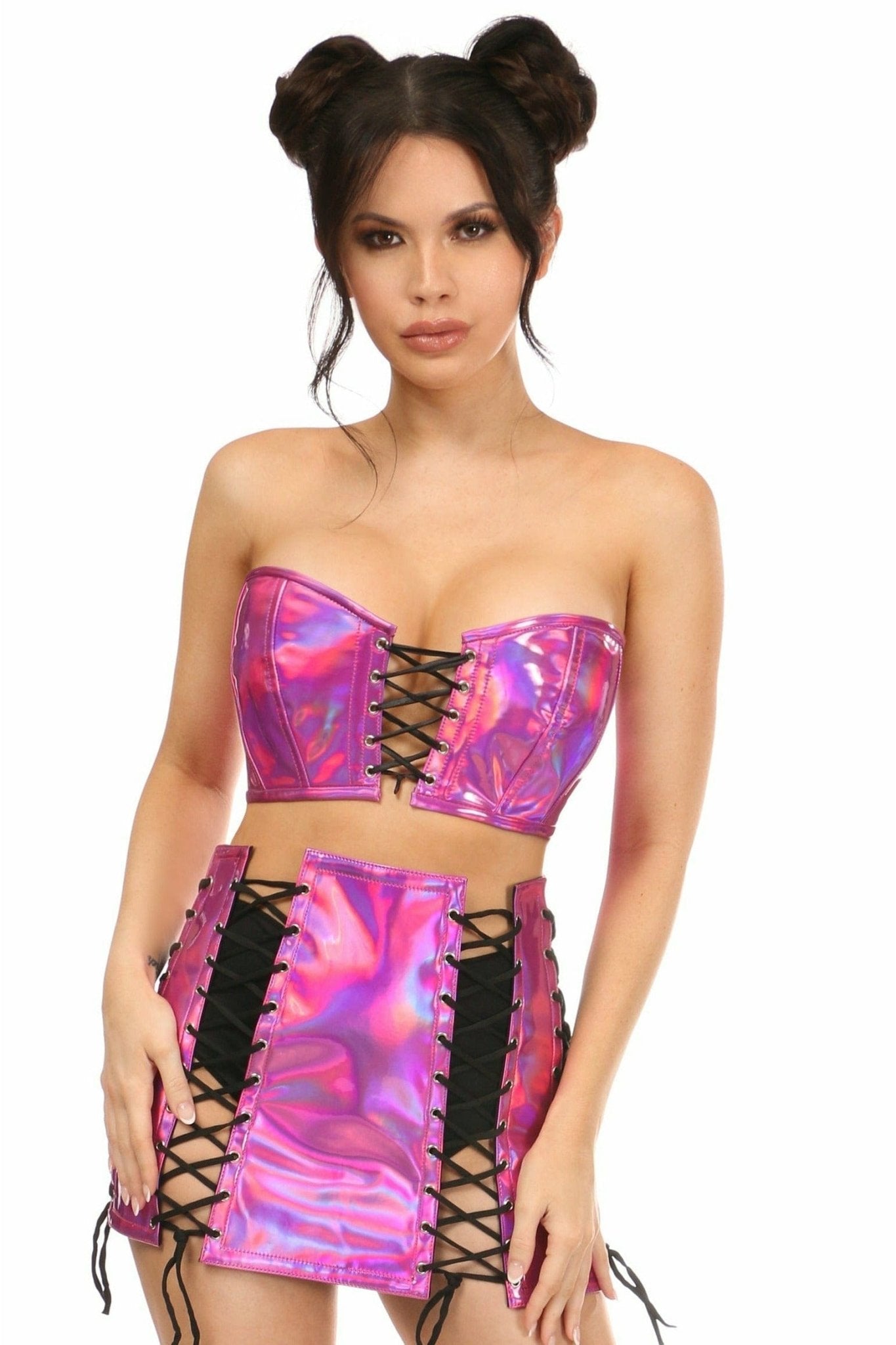 A model showcases the Sexy Two Piece Fuchsia Holo Bustier & Skirt Set, featuring a holographic bustier with lace-up details and a matching skirt.