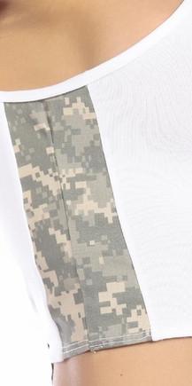 Sexy Concealment Green Digital Camo Military Athletic Crop Top - White/Green features this mid length work out crop top with single strap and authentic military camo side inserts. Bottoms not included.Limited by M fitness line was created and manufactured in the USA in honor of our US Armed Forces. All the digital camo fabric used as accents in this line, both navy blue digi camouflage and UPC green camouflage, are authentic military fabric. We are proud to support our troops and create a line that is dedicated to their hard work, sacrifice, and pursuit of physical fitness.