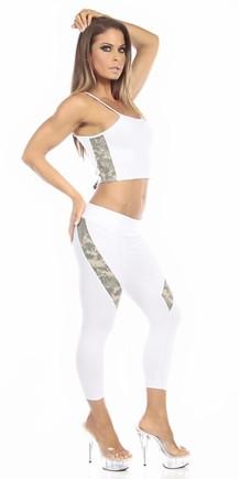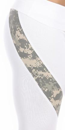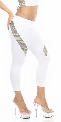 Sexy Hi Lo Waist Universal Camo Pattern Combat Athletic Capri Pants - White/Green features these stretch athletic work out Capri yoga pants with high or low waist roll down option and military pixilated green Digi camo accents. Top not included.Limited by M fitness line was created and manufactured in the USA in honor of our US Armed Forces. All the digital camo fabric used as accents in this line, both navy blue digi camouflage and UPC green camouflage, are authentic military fabric. We are proud to support our troops and create a line that is dedicated to their hard work, sacrifice, and pursuit of physical fitness.