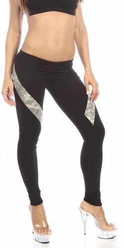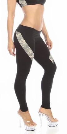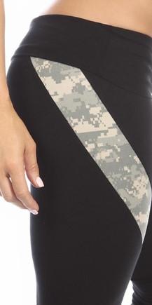 Sexy Hi Lo Waist Universal Camo Pattern Military Work Out Pants - Black/Green features these stretch athletic work out pants with high or low waist roll down option and military pixilated green Digi camo accents. Top not included.Limited by M fitness line was created and manufactured in the USA in honor of our US Armed Forces. All the digital camo fabric used as accents in this line, both navy blue digi camouflage and UPC green camouflage, are authentic military fabric. We are proud to support our troops and create a line that is dedicated to their hard work, sacrifice, and pursuit of physical fitness.