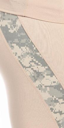 Sexy Hi Lo Waist Universal Camo Pattern Military Work Out Pants - Tan/Green features these stretch athletic work out pants with high or low waist roll down option and military pixilated green Digi camo accents. Top not included.Limited by M fitness line was created and manufactured in the USA in honor of our US Armed Forces. All the digital camo fabric used as accents in this line, both navy blue digi camouflage and UPC green camouflage, are authentic military fabric. We are proud to support our troops and create a line that is dedicated to their hard work, sacrifice, and pursuit of physical fitness.