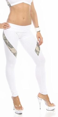Sexy Hi Lo Waist Universal Camo Pattern Military Work Out Pants - White/Green features these stretch athletic work out pants with high or low waist roll down option and military pixilated green Digi camo accents. Top not included.Limited by M fitness line was created and manufactured in the USA in honor of our US Armed Forces. All the digital camo fabric used as accents in this line, both navy blue digi camouflage and UPC green camouflage, are authentic military fabric. We are proud to support our troops and create a line that is dedicated to their hard work, sacrifice, and pursuit of physical fitness.
