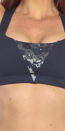 Sexy Multi String Cross Cross Back Tactical Blueberry Pixilated Camo Work Out Top - Navy Blue/Blue features this supportive stretch material work out bra top with criss cross back and authentic digital camo front accent. Bottoms not included.Limited by M fitness line was created and manufactured in the USA in honor of our US Armed Forces. All the digital camo fabric used as accents in this line, both navy blue digi camouflage and UPC green camouflage, are authentic military fabric. We are proud to support our troops and create a line that is dedicated to their hard work, sacrifice, and pursuit of physical fitness.