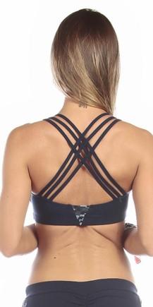 Woman in a black sports top showcasing the Sexy Multi String Cross Cross Back Tactical Blueberry Pixilated Camo Work Out Top with criss-cross back design.