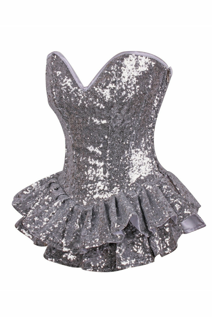 Sparkle for the holiday season in our Deluxe Silver Sequin Steel Boned Mini Corset Dress. Crafted with premium sequin fabric, it features a sweetheart neckline and an 8 spiral steel boned and 4 static boned design for improved fit. A side zipper closure with a privacy panel adds additional comfort, finished with a 6” modesty panel, nickel brass grommets, thick cording and laces at the back. Bring on the holiday spirit in style!